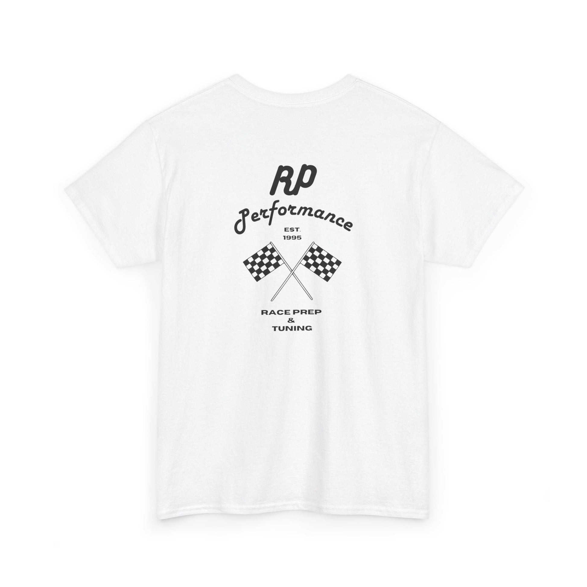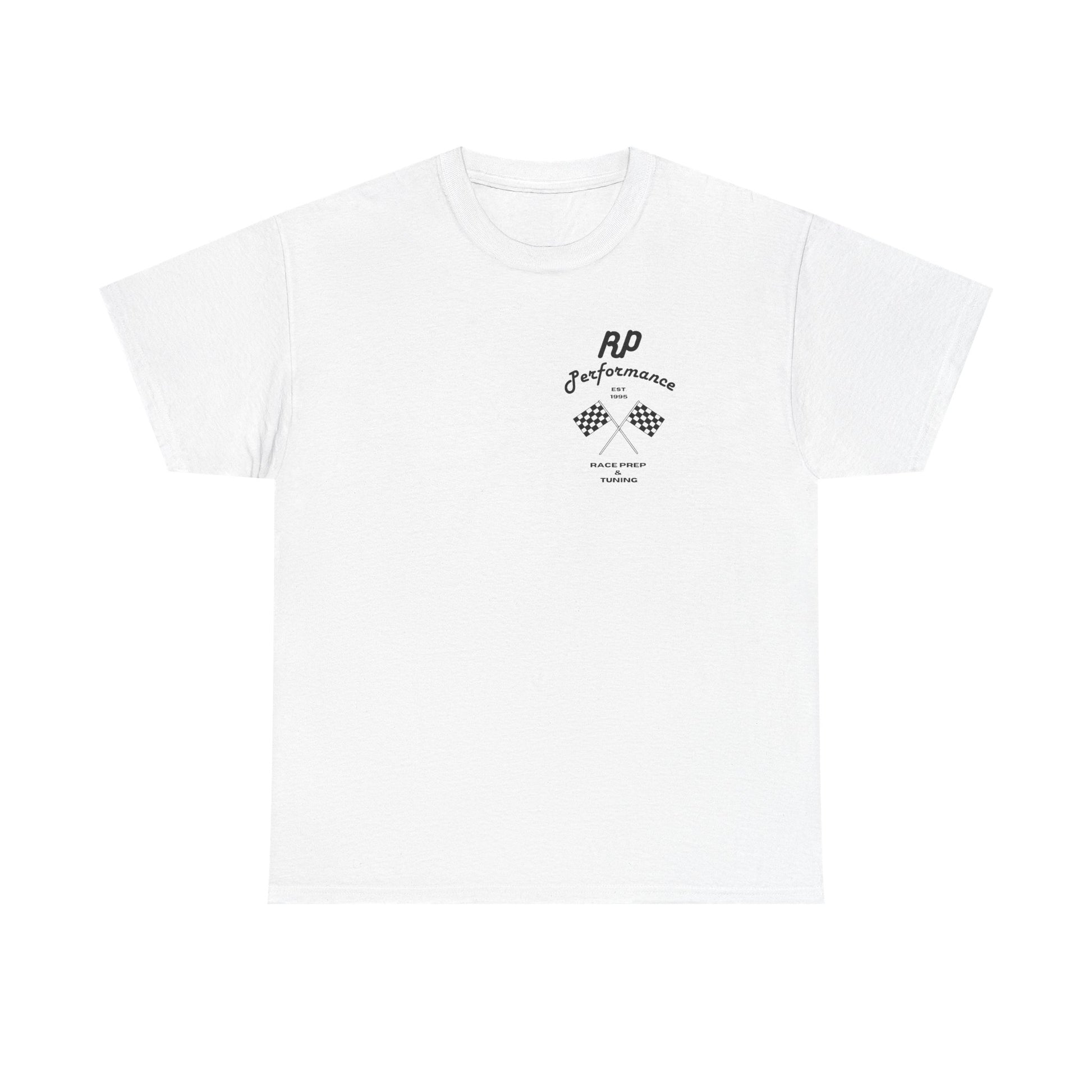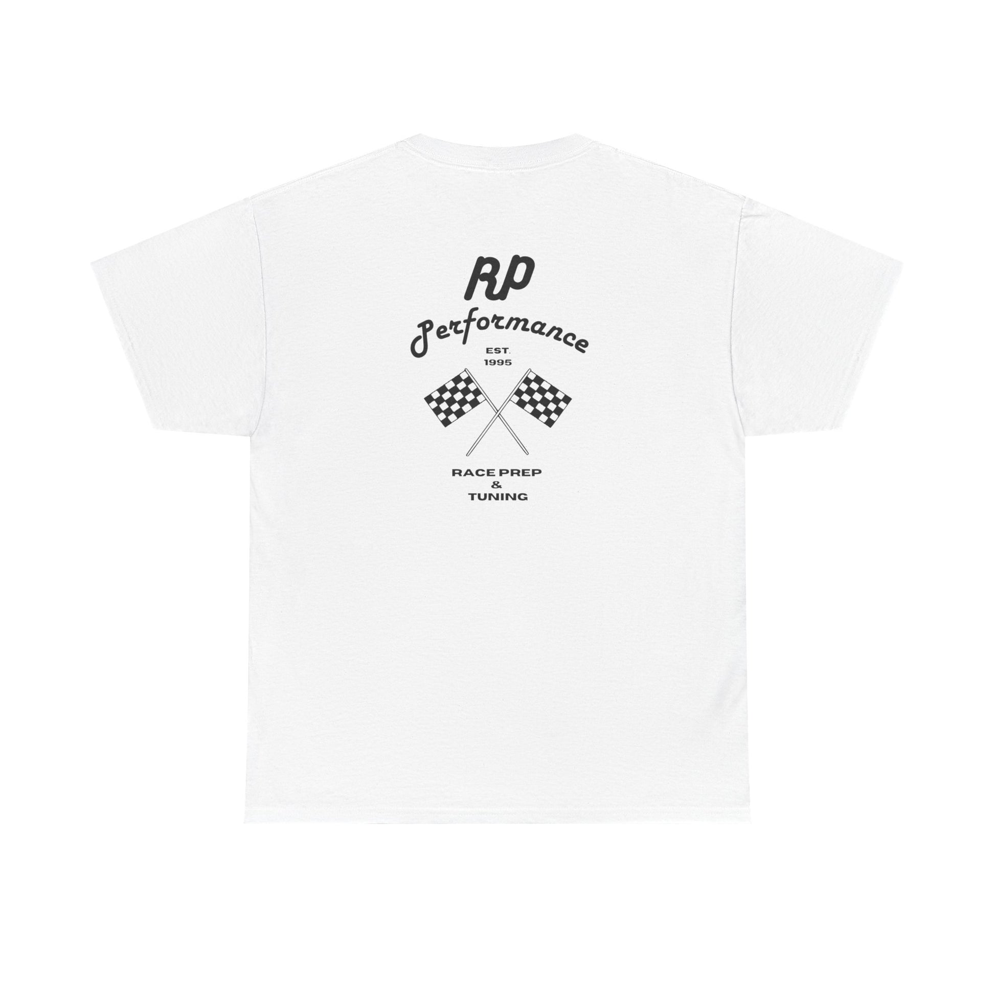 Classic racing tee with a vintage vibe. Features subtle front chest branding and a bold back print with crossed checkered flags and 'RP Performance' lettering.